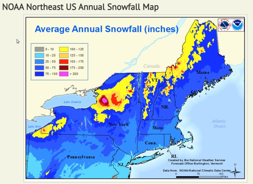 According to Wikipedia, the town of Rutland, New York has an elevation of 978’ as compared to Lake Ontario at 243’. I could find no information about the solar project to determine exactly where it is supposed to go. As you can see in the snowfall map there is a strong gradient of snowfall from the yellow (120 to 125”) to the pink (>200”). Given the elevation difference of Rutland above the Black River Valley I believe that this solar center is affected by this orographic effect and is in the 150” of average snowfall per year area.