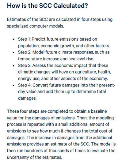According to the Guidance document “Discounting is a common and useful aspect of economic analyses that allows for the balancing of present versus future value and it has been widely discussed in the literature, particularly in its application to the federal social cost of carbon. However, the selection of the discount rate has a large effect on the estimate of the value of carbon, and there is no consensus or uniform scientific basis for the selection of a discount rate.” I emphasized the key point that there is no consensus for selecting the discount rate chosen. The price chosen boils down to value judgements on the part of the State.