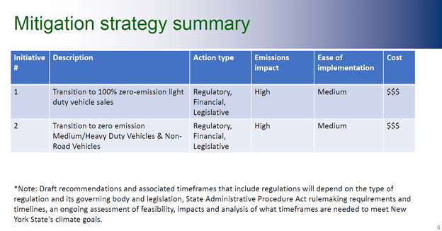 On May 10, 2021 the Transportation Advisory Panel presented their strategies to the Climate Action Council. An outline of their recommendations is also available. As shown in the following slide from the recommendations the first mitigation strategy initiative is to transition to 100% zero-emission light duty vehicle sales.