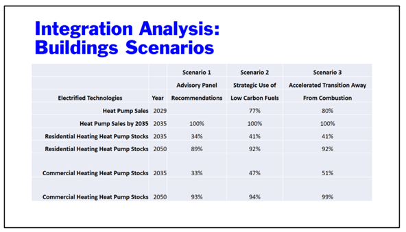 Four scenarios are included in the integration analysis. Scenario 1 incorporates recommendations by the Advisory Panels for potential reduction strategies that included ambitious actions but the emission reductions were only 34% by 2030 instead of the 40% target. The remaining scenarios were designed to meet the 40% target at a minimum and include even more ambitious actions. Scenario 2: uses low carbon fuels (bioenergy and hydrogen) for combustion for difficult to electrify applications and for times of low renewable availability. In order to placate the members of the Climate Action Council who believe that all forms of combustion are bad Scenario 3 reduces combustion as much as possible and accelerates electrification of buildings and transportation actions. Scenario 4 was developed to respond to those on the Climate Action Council who think that more reductions faster are possible which pushes all the actions further.