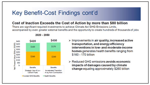 The final painful aspect of the Climate Act is the cost. The first summary of costs and benefits was presented at the October 14, 2021 Climate Action Council Meeting and I provided my first impression here. Costs in Scenario 2 are estimated to be $340 billion and if we start spending that in 2025 that is over $13 billion per year. They claim that the cost of inaction exceeds the cost of action by more than $80 billion. The basis for that claim is that improvements in air quality, increased active transportation, and energy efficiency interventions provide health benefits ranging from $160 – 170 billion and that reduced GHG emissions avoid economic impacts of damages caused by climate change equaling approximately $260 billion.