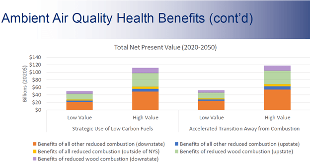 The integration analysis modeling monetizes the air quality improvements over the period 2020 to 2050 to come up with the $50 –$120 billion claimed health benefits. The components of the benefits are described in the following slide (meeting recording at 3:06:43). It shows that the two largest sources of benefits are coming from “benefits of all other reduced combustion (downstate)” and “benefits of reduced wood combustion (upstate)”. The integration analysis develops strategies to meet the targets but it does not specify how regulations will be written to implement them. In order to realize those benefits upstate home heating with wood has to be replaced by electrification and energy efficiency effectively banning wood heating. Policy options could include a wood burning prohibition mandate or they could assume that their electrification and energy efficiency solutions are so wonderful that everyone will willingly convert. Authors could also believe that the efficiency of wood-burning furnaces could be improved so much that the impacts will be reduced. In practice, however, getting any combustion source “tuned” to minimize emissions is an operator challenge and I think it is unlikely that owners will take the time and effort to master that skill.