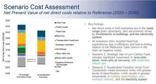 The following slide compares the costs of Scenarios 2 and 3. Each bar on the left consists of the total net costs (values above zero) and the fuel savings (values below zero). The costs for each category are the incremental costs, for example the higher cost of a heat pump relative to the cost of a gas furnace. There is a blue diamond on the bar that represents the difference between the net costs and fuel savings and that is the value they list elsewhere for the costs. The brackets around the diamond are their uncertainty ranges. The key findings on the right are self-explanatory. Note that the major difference between the scenario 2 and scenario 3 costs is the expenditures necessary to produce the renewable fuels.