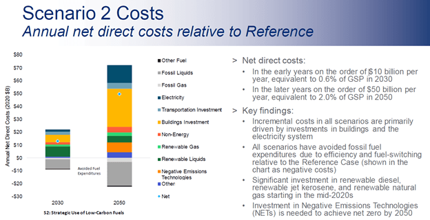 The next slide (discussed at 1:35:00 in the recording) lists the Scenario 2, strategic use of low-carbon fuels, annual net direct costs. In the early years the net direct costs are on the order of $10 billion per year, equivalent to 0.6% of GSP in 2030. In the later years the costs are on the order of $50 billion per year, equivalent to 2.0% of GSP in 2050. There is a similar slide for Scenario 3.