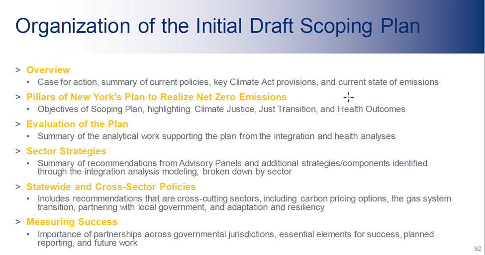 The Climate Leadership and Community Protection Act (Climate Act) codifies a New York approach to achieving net-zero emissions by 2050. The October 14, 2021 Climate Action Council meeting briefly discussed the Scoping Plan that will “achieve the State’s bold clean energy and climate agenda”. This post describes the organization of the initial draft of the scoping plan as presented at the October 14 Climate Action Council meeting.