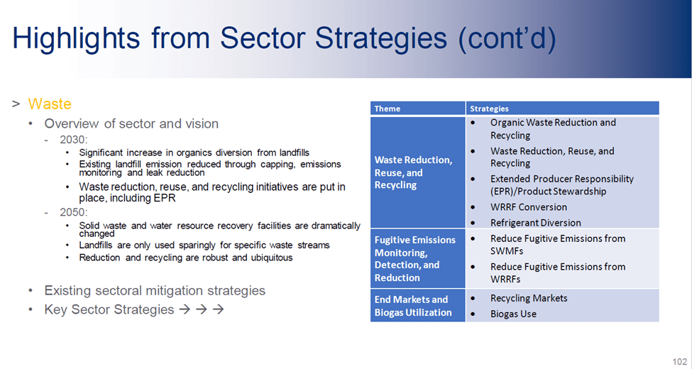 I think one can argue that the waste sector has a lot of wishful thinking in their strategies. It basically boils down to planning on waste reduction, reuse, and recycling initiatives that are so effective that landfills are “only used sparingly for specific waste streams”. That has been a goal of the state for decades but has never panned out. It is not clear why the climate action plan will fare differently.