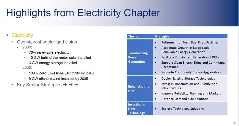 The overview of this chapter (1:22:05) noted that by 2030 the 70% of the electricity used will come from renewable sources, that 10 GW behind-the-meter solar and 3 GW energy storage will be installed.