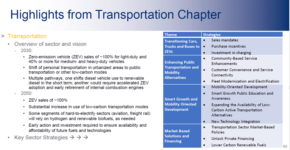 The transportation discussion started at 1:34:56. The overview noted that by 2030 zero-emission vehicle (ZEV) sales of ~100% for light-duty and 40% or more for medium-and heavy-duty vehicles are expected and that personal transportation in urbanized areas will shift to public transportation or other low-carbon modes.