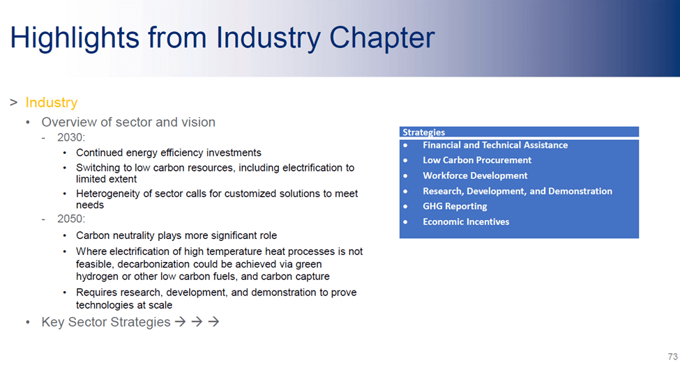 The industry chapter discussion started at 1:39:00. The 2030 overview says there will be continued energy efficiency investments, switches to low carbon resources, including electrification to a limited extent, and that the heterogeneity of the sector calls for customized solutions to meet needs. Heterogeneity means there are so many different industries and so many challenges to reducing emissions from all of them that they cannot say much.