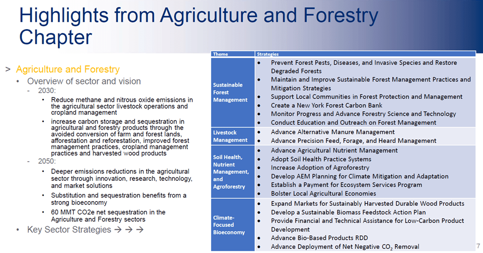 Agriculture & Forestry Chapter The discussion of this chapter starts at 1:46:55. The overview for 2030 states the plan is to reduce methane and nitrous oxide emissions in the agricultural sector from livestock operations and cropland management and increase carbon storage and sequestration in agricultural and forestry products through the avoided conversion of farm and forest lands, afforestation and reforestation, improved forest management practices, cropland management practices and harvested wood products