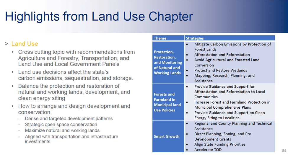 The land use chapter discussion starts at 1:55:48. The overview points out that this is a cross cutting topic with recommendations from Agriculture and Forestry, Transportation, and Land Use and Local Government Panels. It notes that land use decisions affect the state’s carbon emissions, sequestration, and storage, and that it is necessary to balance the protection and restoration of natural and working lands, development, and clean energy siting. There will be issues related to the plans to “arrange and design development and conservation” to meet the following: