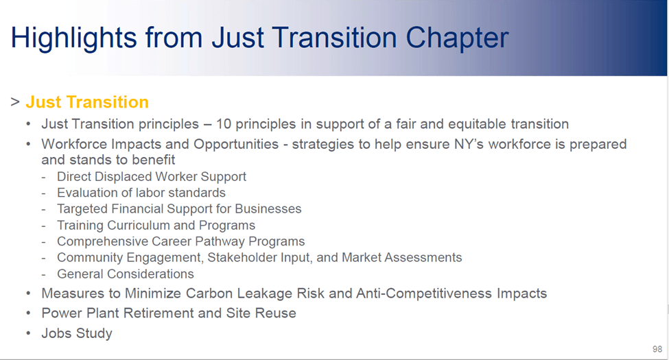 The Just Transition workgroup (starting at 2:10:55) is supposed to advise the Council on issues and opportunities for workforce development and training related to energy efficiency measures, renewable energy and other clean energy technologies, with specific focus on training and workforce opportunities for disadvantaged communities, and segments of the population that may be underrepresented in the clean energy workforce such as veterans, women and formerly incarcerated persons. principles –10 principles in support of a fair and equitable transition.