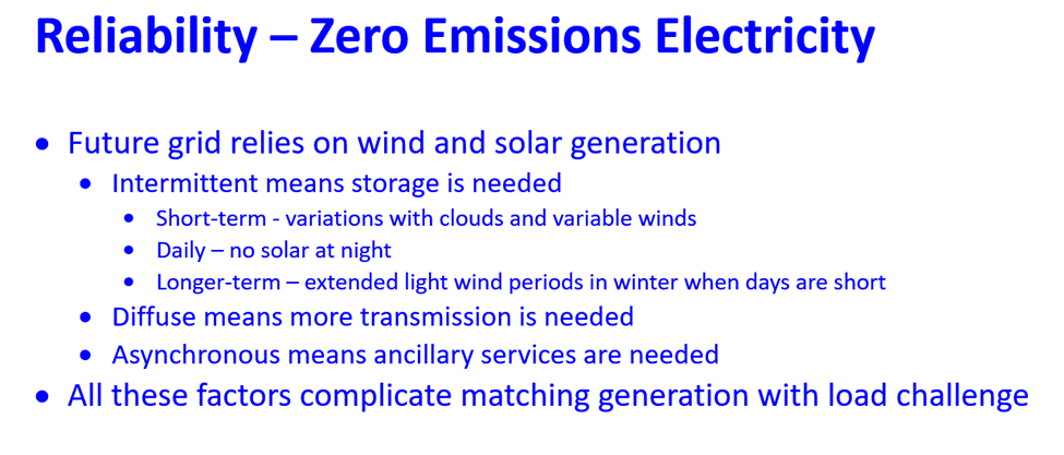 This slide explains that significant infrastructure is required for the transition and that it will complicate matching generation and load. Wind and solar are not dispatchable without energy storage, transmission and ancillary services resources. I pointed out that short-term variations in wind and solar require an energy storage resources that is relatively small but will be used frequently. The Li-Ion 4-hour storage batteries work well for this requirement. There are significant diurnal variations in renewable resources if solar is a major component. This needs to be addressed by energy storage resources that are on the order of the size of the solar capacity in the system. In my opinion this resource has not been implemented on a commercial scale. In addition, additional energy storage is needed for cloudy days. The resources needed for both these applications will be used regularly. The biggest problem is the energy storage needed for infrequent but extended periods of low wind and solar output. A large amount of long-term storage capacity is needed to cover a multi-day renewable resource drought but it will not be used a lot. If it is not used much how will the market pay for the resource?
