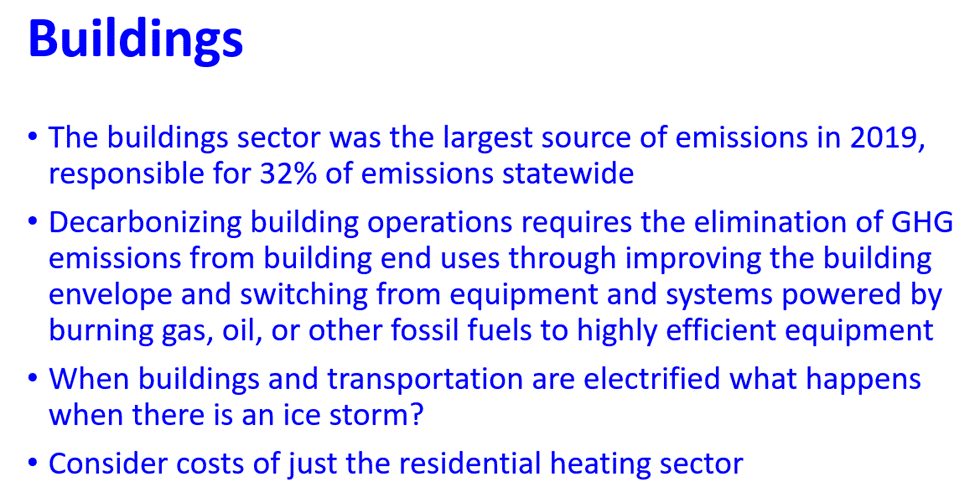 Even though electric grid reliability is an important topic it also it is one that most people don’t have any experience with so I included a description of reliability and affordability related to home electrification that we all understand. Because the buildings sector is the largest source of GHG emissions, decarbonization is a primary strategy. My primary residential reliability concern is what happens when there is an extended electric outage? There is not a lot of information available about the cost affordability for residential home heating so I added slides discussing residential heating sector costs.