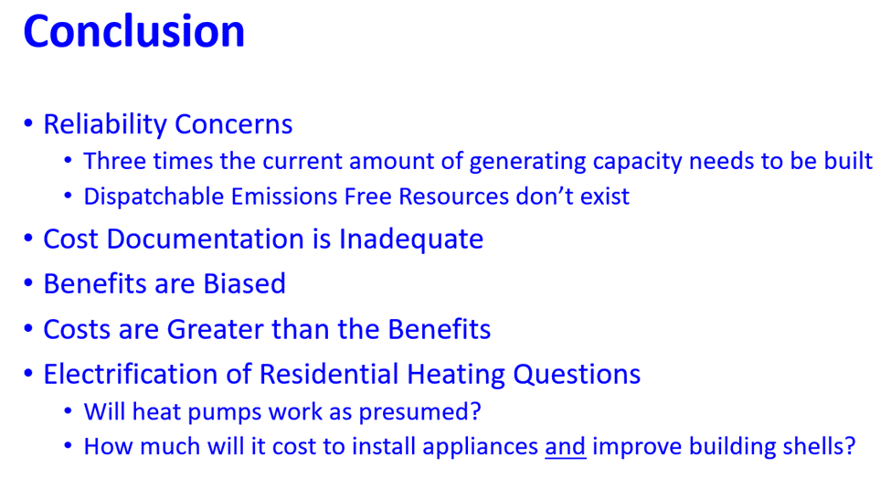 The presentation concluded that everybody wants to do something about climate change and do right by the environment. However, it is important that we don’t do something that will do more harm than good when we try to address climate change. Based on my analysis of the proposed strategies in the Scoping Plan it will do more harm than good. It boils down to the fact that existing technology is just not ready for the magnitude and schedule of the transition outlined in the Scoping Plan.