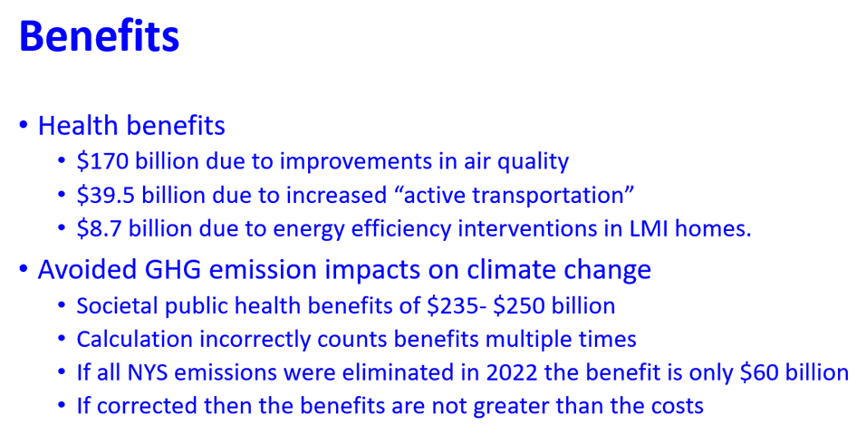In order to prove the Climate Act is in the best interests of the State, the Scoping Plan claims benefits. I explained that I thought that the proposed health benefits were exaggerated, that I have been unable to verify their estimates and that they are all societal benefits that will not directly affect consumer costs.