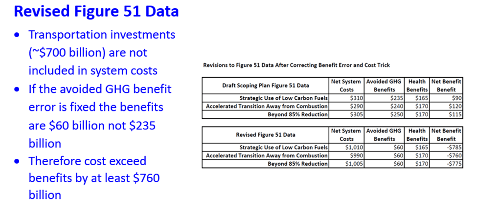 The following slide explains that corrections to the inaccurate benefits and misleading costs presented in the Scoping Plan invalidate the claim that the benefits are greater than the costs. Approximately $700 billion should be added to the net system costs column in the revised section of the table and the avoided GHG benefits should be only $60 billion. The costs are greater than the benefits by at least $760 billion.