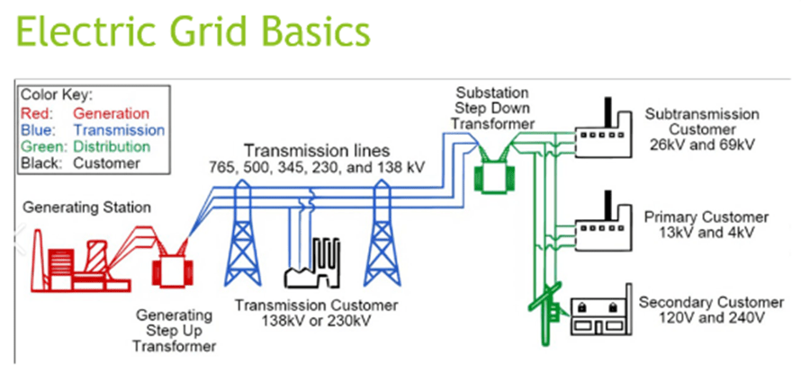 In order to illustrate the basic electric grid I included the following diagram. It shows that generating station provide power using turbine generators that convert mechanical energy into electric energy using water, steam, or other means to spin the turbines. I have heard the argument that the grid is inefficient because there are power losses between the generating station and the users but the fact is that New York will always be dependent upon a transmission system because there is insufficient space in New York City for sufficient renewable resources to provide the energy needed to keep the lights on. Power output from generating plants is stepped up at substation transformers for long distance transmission and then substation transformers step down the power for the distribution system for use by consumers.