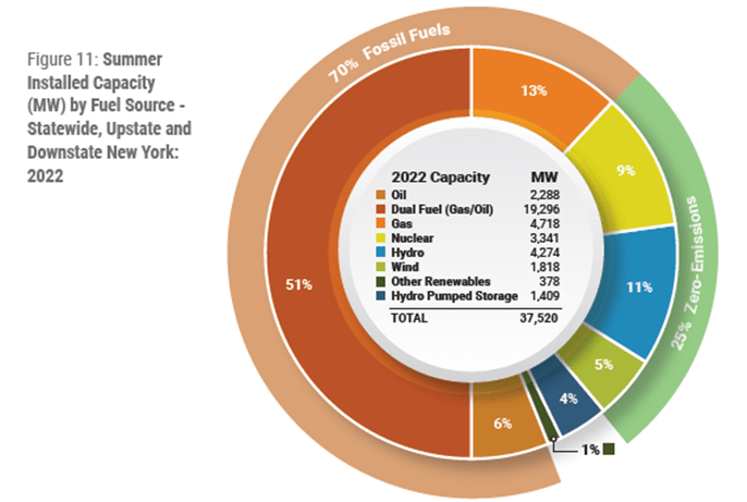 The NYISO 2022 Power Trends Report includes this description of the capacity (power available in MW) for the existing system. It shows that 70% of installed capacity is fossil fueled and 25% is zero emissions. Wind and other renewables (solar energy, energy storage resources, methane, refuse, or wood) account for only 6% of installed capacity. Note that NYISO does not measure distributed solar directly. In their accounting it reduces the load so less generation is needed.