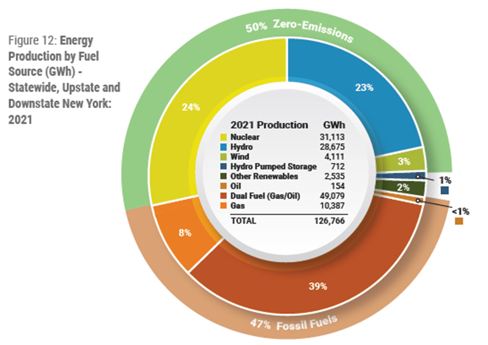The NYISO 2022 Power Trends Report includes this description of Energy Production (MWh). Note that 50% of New York’s generated electricity is zero-emissions. There is a Climate Act target to “Increase renewable sources to 70 percent by 2030” that does not include zero-emissions nuclear. One reason that I am skeptical of the Climate Act is because 24% of renewable source energy produced is hydro and hydro pumped storage. Wind and other renewables (solar energy, energy storage resources, methane, refuse, or wood) account for 5% of energy produced. The 29% of the energy produced from renewable sources is far less than the 70% by 2030 target. I don’t think that it is feasible to develop over 29GW of renewable resources between now and 2030 with supply chain issues, constraints on permitting, procurement, and construction when development of supporting infrastructure is also needed for off-shore wind development.