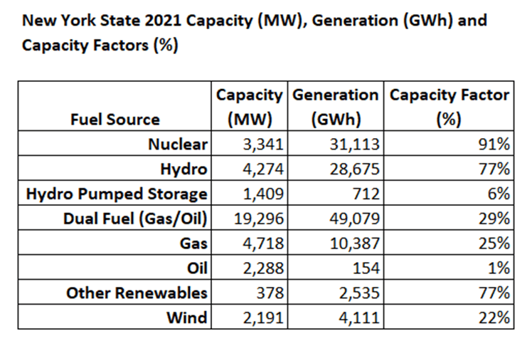The capacity factor is a useful metric to understand electric generation resources. The annual capacity factor equals the actual observed generation (MWh) divided by maximum possible generation (capacity (MW) times the 8,760 hours. In New York nuclear is a key contributor but the Administration recently shut down 2,000 MW at Indian Point. At this time the simple-cycle peaking turbines are being phased out and peaking power is produced by oil-fired units and spare capacity in the gas and dual fuel units. Note that oil is a unique New York resource. Imagine the difficulty replacing that capacity with a resource that would only need to run 1% of the time. Note that in 2021 New York land-based wind only had a 22% capacity factor.