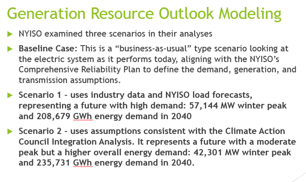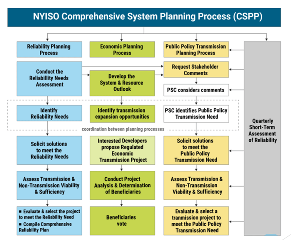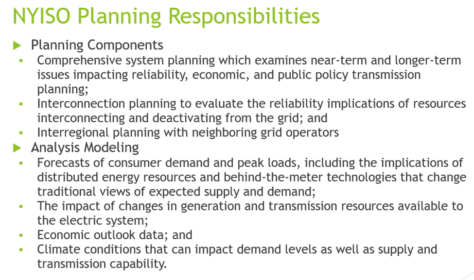 I included the following summary of the NYISO Comprehensive System Planning Process to show all the components and to highlight the recent addition of a new component. In order to address the Climate Act NYISO added “Develop the System & Resource Outlook” component that looks at a longer planning horizon that was included previously.