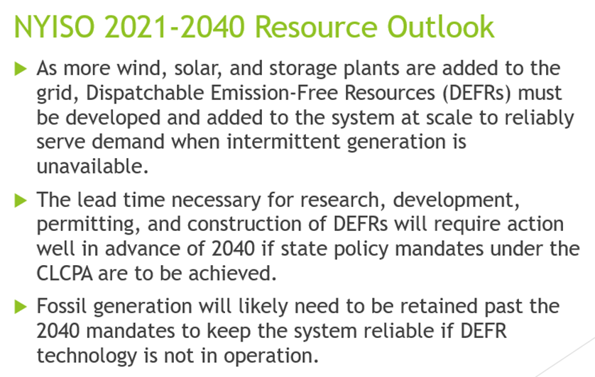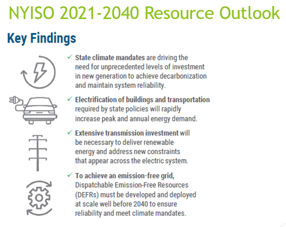 The first report for the resource outlook component was released a couple of months ago. The 2021-2040 System & Resource Outlook can be downloaded from NYISO and a datasheet summary of key takeaways of the Outlook report is also available. The summary describes the four key findings: an unprecedented buildout of new generation is needed, load will increase when we electrify everything, transmission is necessary and must be expended to get diffuse renewables to New York City and a new resource has been identified: Dispatchable Emissions-Free Resource (DEFR). That resource is essentially a fossil-fueled turbine without any emissions.