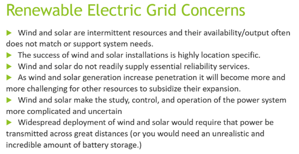 Many of the most vocal supporters of the Climate Act believe that existing renewable technology is sufficient to transition the New York electric grid to zero-emissions resources by 2040 and that suggestions that may not be true are misinformation. In order to address that fallacy my presentation concentrated on my concerns about the reliability risks of an electric grid that is dependent upon intermittent and diffuse renewable resources. The electric grid is crucial to New York’s energy future because the primary de-carbonization strategy is to electrify everything possible using those resources. I described the existing grid, generation resource planning, the current New York State system, and the projected New York State system. Electric grid reliability requires that generation resources match electric load at all times and the challenges associated with wind and solar in this regard are ignored by those who believe that existing technology is sufficient.