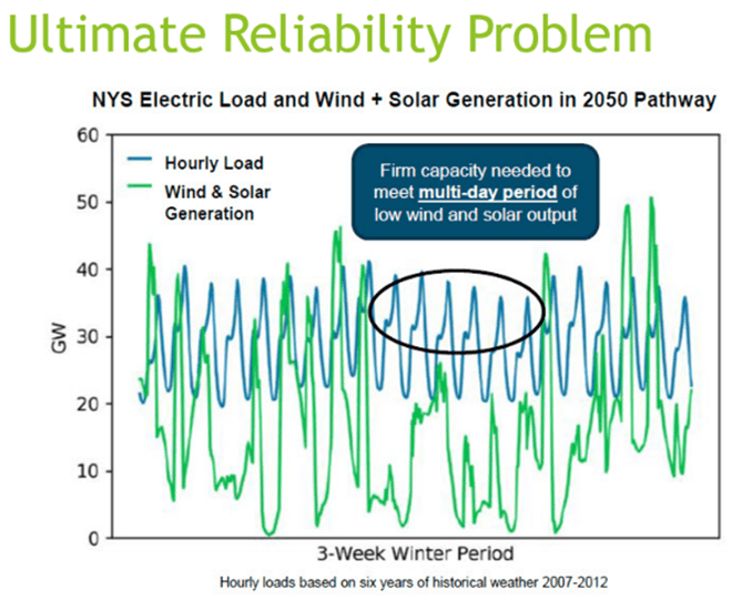 The ultimate reliability problem is illustrated in the following figure. This graph illustrates the long-duration wind lull problem from an early presentation to the Climate Action Council. It explicitly points out that firm capacity (DEFR) is needed to meet multi-day periods of low wind and solar resource availability. The Council has known about the problem all along but have basically pushed it aside as inconvenient. The thing to remember is that in order to prevent catastrophic blackouts caused because intermittent wind and solar are unavailable, NYISO and the Integration Analysis are both banking on DEFR capacity. Using wind, solar and storage exclusively makes meeting the worst-case renewable resource gap much more difficult.
