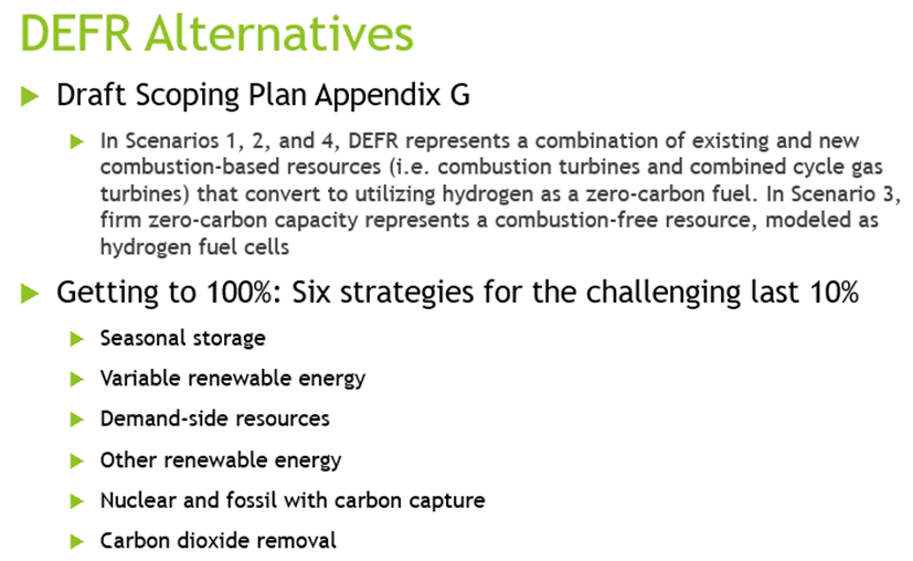 There is no doubt that the fate of future reliability is inextricably tied to DEFR success. The next slide discusses DEFR options. The Draft Scoping Plan acknowledges the need for DEFR and proposes seasonal hydrogen storage as a placeholder technology. NYISO, while explaining that the resource is necessary, has offered no recommendations what technology could fill the need. The NREL authors of Getting to 100%: Six strategies for the challenging last 10% described six DEFR strategies