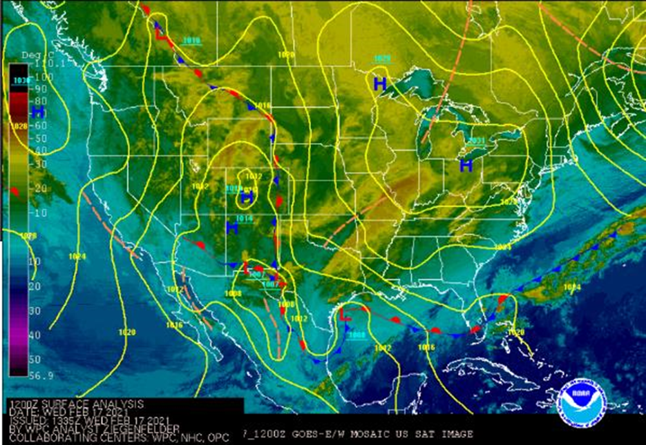 While the concept that the wind is always blowing somewhere else is indisputably true the issue is that in order to keep the lights on we need power at specific times and places from a dedicated source. New York City’s peaking turbines were located in specific locations to maintain reliability and they were dedicated to that application. New York’s reliability standards were developed based on decades of experience that showed that a certain installed reserve margin would guarantee that New York reliability standards could be maintained. Against that backdrop consider the following weather map on February 17, 2021. The Texas energy debacle was associated with this intensely cold polar vortex huge high pressure system. Remember that winds are higher when the isobars are close together. On this day there are light winds from New York to the southeast, west, and north including the proposed New York offshore wind development area. There are packed isobars in northeastern New England, in the western Great Plains, and central Gulf Coast. In order for New York to guarantee wind energy availability from those locations, wind turbines and the transmission lines between New York and those locations would have to be dedicated for our use. Otherwise I think it is obvious that jurisdictions in between would claim those resources for their own use during these high energy demand days. It is unreasonable to expect that building those resources for a once in a few years situation could possibly be an economic solution.