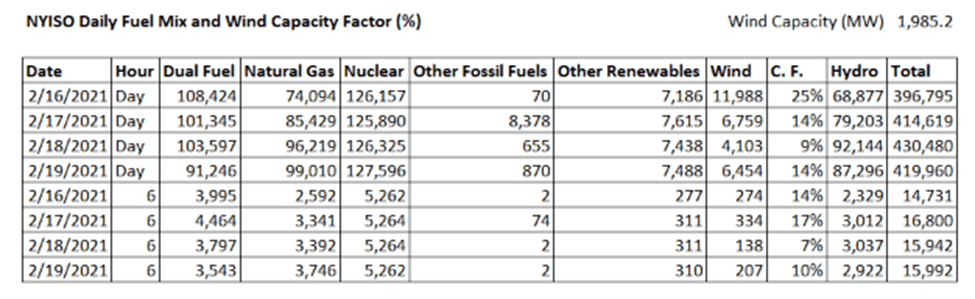 Another way of looking at this issue is to consider the NYISO fuel mix data available at the NYISO Real-Time Dashboard. I downloaded four days of February 2021 data to generate the following table. It shows that a high pressure system reduces wind resource availability across the state. The data show that less than a quarter of the daily wind capacity is available for this period. Note that the worst-case hour on 2/18/21 at 7:00 AM wind production was only 138 MW out of a New York total of 1,985 MW for a capacity factor of 7%. If we were to overbuild wind resources to replace the fossil capacity of 7,191 MW on that hour you would need 102,729 MW of wind resources.