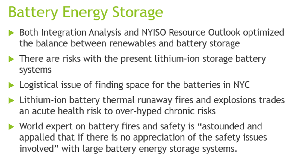 Clearly, overbuilding alone is not a viable solution. You have to have new energy storage and the currently available technology is battery energy storage systems. Both the Integration Analysis and NYISO Resource Outlook optimized the balance between renewables and storage but still found that DEFR was needed. Existing technology proponents claim that over-building wind, solar, and storage is viable but have not countered the NYISO or Integration Analysis modeling results. I am concerned about the risks associated with the current preferred technology: lithium-ion storage battery systems. The first risk is logistical inasmuch as battery storage footprints are larger than the existing peaking turbine sites so finding space for the batteries is an issue. Worse is the fact that lithium-ion storage batteries have the risk of thermal runaway fires and explosions that trade an acute health risk for chronic, and speculative, in my opinion, risks. Paul Christensen, Professor of Pure and Applied Electrochemistry at Newcastle University in the United Kingdom gave a presentation at PV magazine’s Insight Australia event in 2021 that describes the risks. His videos of thermal runaway tests are terrifying. He is one of the world’s leading experts on battery fires and safety and said global uptake of lithium-ion battery technology has “outstripped” our knowledge of the risks. He also stated that he is “astounded and appalled that if there is no appreciation of the safety issues involved” with large battery energy storage systems. This is another feasibility issue that is unaddressed by the Draft Scoping Plan.