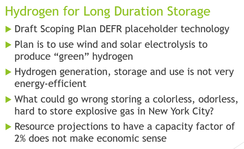 Hydrogen storage is the Draft Scoping Plan DEFR placeholder technology. The plan is to use wind and solar electrolysis to produce “green” hydrogen from water. The stored hydrogen would either be combusted to power turbines or used in fuel cells. There are fundamental issues associated with the use of hydrogen that I detail on my blog. Hydrogen generation, storage and use loses much more energy than alternatives and may not even have a net energy benefit so it is unlikely to be sustainable. In order for it to provide the necessary peaking power in New York City a colorless, odorless, hard to store explosive gas will have to be stored and used. I don’t think that the technology will be embraced in the City. All the infrastructure necessary to produce, store, and use will have to be built and paid for to meet a projected capacity factor of 2%. I doubt that makes economic sense.