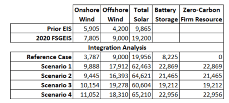 Comparison of Integrated Analysis Projected Capacity and Cumulative Environmental Impact Statements (MW)