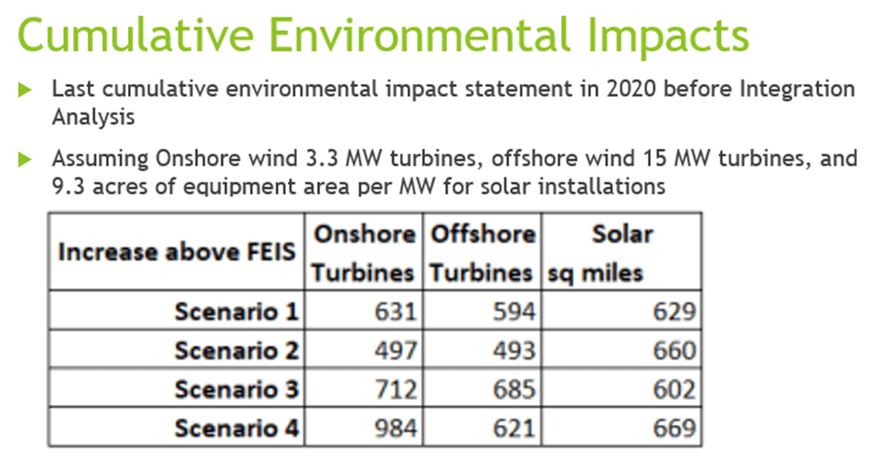 The following table used in the presentation shows the number of wind turbines and areal extent considered in the completed cumulative impact statements relative to the projected numbers in the Integration Analysis. The Draft Scoping Plan calls for at least 497 more onshore wind turbines, 493 more offshore wind turbines and 602 more square miles covered with solar equipment than has been evaluated in cumulative analysis.