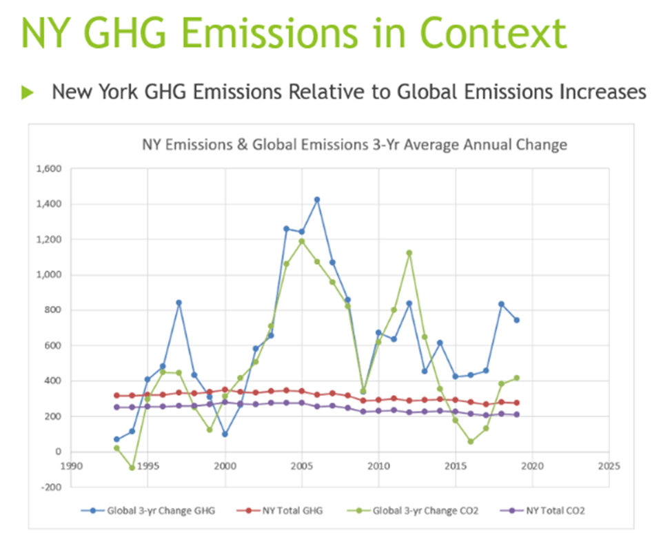 When New York’s GHG emissions are considered relative to global emissions I conclude that New York only action is pointless. In the presentation I compared New York emissions to global emissions in two graphs. I used CO2 and GHG emissions data for the world’s countries and consolidated the data in a spreadsheet. I used the New York State GHG data set CO2e AR4 100 year global warming potential GHG values for consistency. Plotted on the same graph New York GHG and CO2 emissions cannot be differentiated from zero.