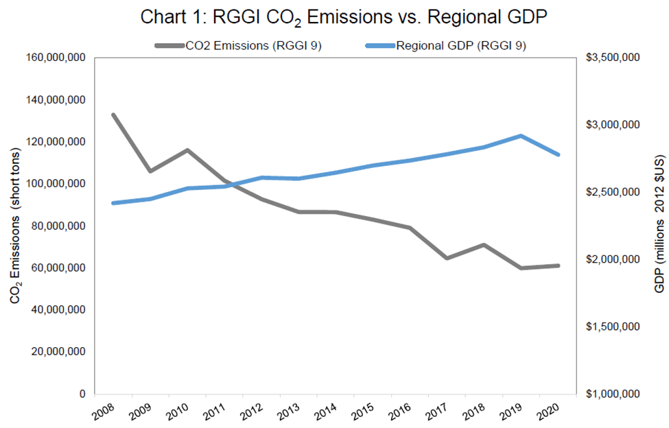 RGGI is a market-based program to reduce greenhouse gas emissions (Factsheet). It has been a cooperative effort among the states of Connecticut, Delaware, Maine, Maryland, Massachusetts, New Hampshire, New York, Rhode Island, and Vermont to cap and reduce CO2 emissions from the power sector since 2008. New Jersey was in at the beginning, dropped out for years, and re-joined in 2020. Virginia joined in 2021 and Pennsylvania has joined but is not actively participating in auctions due to on-going litigation. According to a RGGI website: “The RGGI states issue CO2 allowances which are distributed almost entirely through regional auctions, resulting in proceeds for reinvestment in strategic energy and consumer programs. Programs funded with RGGI investments have spanned a wide range of consumers, providing benefits and improvements to private homes, local businesses, multi-family housing, industrial facilities, community buildings, retail customers, and more.”