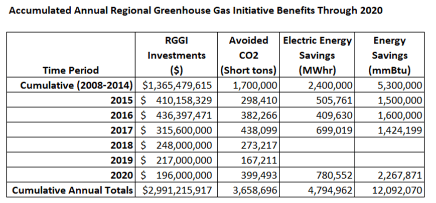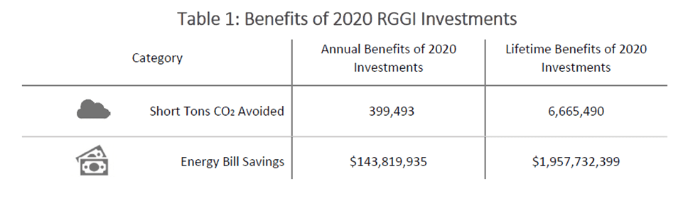- Energy efficiency makes up 35% of 2020 RGGI investments and 53% of cumulative investments. Programs funded by these investments in 2020 are expected to return about $1.2 billion in lifetime energy bill savings to more than 56,000 participating households and over 700 businesses in the region and avoid the release of 4.6 million short tons of CO2.