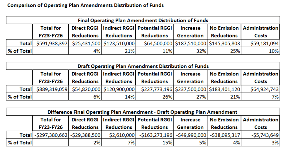 As I noted above, my comments explained that if the operating plan for the RGGI auction proceeds did not invest sufficiently in programs that directly reduce emissions then there is a possibility that affected units may not be able to provide power when needed because they don’t have sufficient allowances to cover operations. My point was that programs that do not directly, indirectly or could eventually reduce RGGI source emissions by displacing the energy they provide should be emphasized and programs that increase RGGI source emissions should be de-emphasized. The following table shows that the final version of the amendment plan for RGGI auction proceeds does the exact opposite. The total funding for RGGI reduction programs drops by $190 million and the % of the total goes down 9% to only 36%.