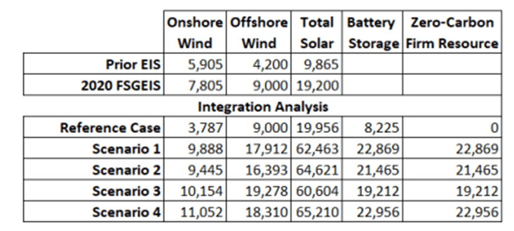 Comparison of Integrated Analysis Projected Capacity and Cumulative Environmental Impact Statements (MW)