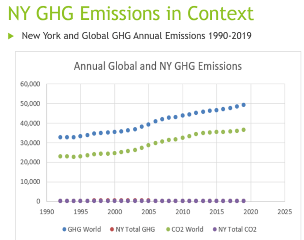 When New York’s GHG emissions are considered relative to global emissions I conclude that New York only action is pointless. In the presentation I compared New York emissions to global emissions in two graphs. I used CO2 and GHG emissions data for the world’s countries and consolidated the data in a spreadsheet. I used the New York State GHG data set CO2e AR4 100 year global warming potential GHG values for consistency. Plotted on the same graph New York GHG and CO2 emissions cannot be differentiated from zero.