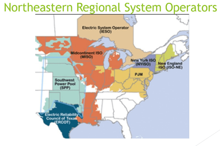 I included the following diagram to make the point that New York is in the Eastern Interconnection which is the largest machine in the world. Incredibly all the fossil, hydro, and nuclear generating stations in the Eastern Interconnection work together. In order to provide 60 Hz power the generating turbines are synchronized to run at 3600 revolutions per minute. Operators keeps the voltages as constant as possible in the entire area but have the advantage that those turbines provide inertia and they can dispatch generating resources as necessary. Unfortunately, wind and solar resources are inverter based and cannot be dispatched as needed.