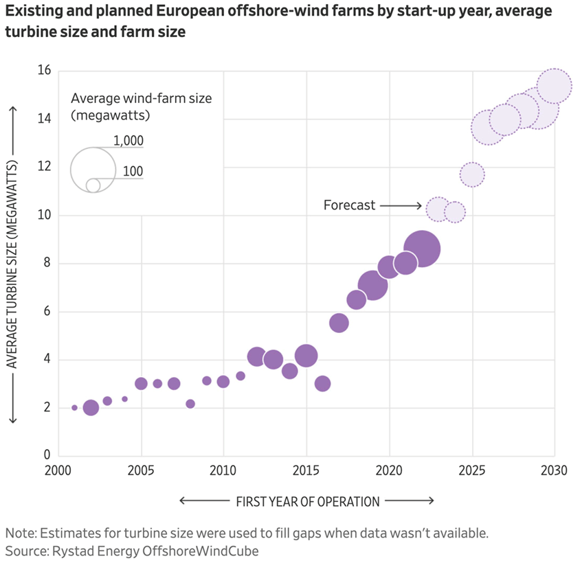 The second article How Big is Too Big for an Offshore Wind Turbine by Ed Ballard included the following figure that shows that offshore wind turbines are getting bigger over time. It appears that the South Fork Wind 11 MW turbines will equal the forecast average turbine size in Europe. However, the article points out there is a problem with these large turbines.