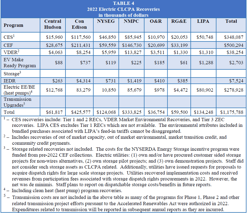 Table 4: 2022 Electric CLCPA Recoveries summarizes costs recovered in 2022 by utilities for electric programs. The costs recoveries include: CES (electric only), CEF (electric only), certain VDER (electric only), Electric Vehicle Make Ready Program (electric only), Clean Heat programs (electric only), Integrated Energy Data Resource (electric only), and Utility Energy Efficiency programs (electric and gas). The table states that $1,175,788,000 in Climate Act costs were recovered in 2022.