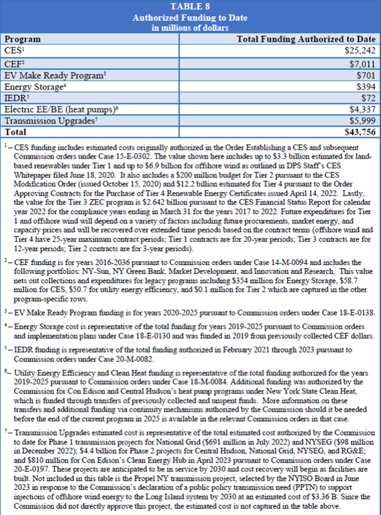 The takeaway message from Table 8 is that the authorized funding to date of program costs that will eventually make their way to ratepayer bills totals $43.756 billion. I assume that all the CES costs ($25.242 billion) are associated with renewable energy development. Although there are other components that could support the zero-emissions mandates, I am not aware of proposed adjustments to any other programs.