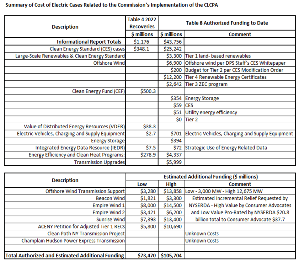 Recall that Table 4: 2022 Electric CLCPA Recoveries in the Informational Report summarizes costs recovered in 2022 by utilities for electric programs. The table states that $1,176 million in Climate Act costs were recovered in 2022 and it shows the amount these costs affected utility bills for seven utilities and eight program categories. I assume that future ratepayer costs will increase proportionally to the
