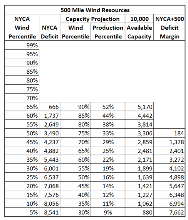 Table 4 provides an estimate of the wind generated capacity available to cover the deficit margin in Table 3 outside the control area in an area similar in size and characteristics to the NYCA 500 miles away from New York City. For this thought experiment I assumed that the wind capacity at any hour in this region would be at a production percentile 25% higher than the corresponding NYCA percentile. I believe that there is higher level of spatial correlation than those who believe that the wind is always blowing somewhere acknowledge. In this example, when NYCA wind levels are at the 65th percentile I presume that 500 miles away the wind resource will be at the 90th percentile. Because I believe that wind in all regions of a similar size to New York will exhibit the same wind distribution pattern, a key takeaway is that wind resources 500 miles away are insufficient to always provide support when power outside the NYCA is needed. The 500-mile resources only cover the NYCA deficit down to 55th NYCA percentile corresponding to the 500-mile 80th percentile. We must go out at least another 500 miles for reliable power.