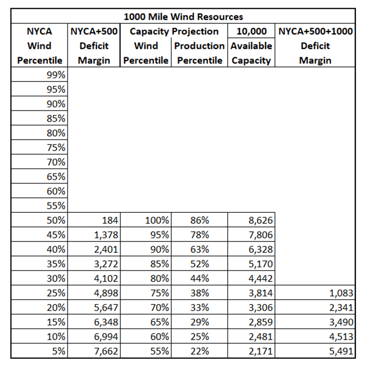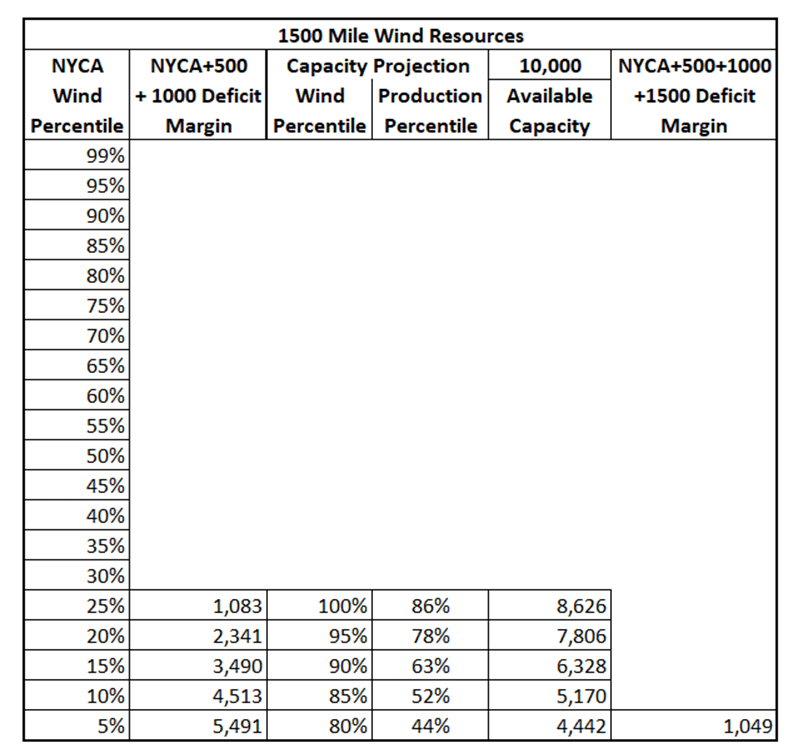The 1000-mile resource availabilities cover the NYCA deficit down to 25th NYCA percentile and the 1000-mile 75th percentile so we must go out another 500 miles to assure replacement of the existing fossil generation.