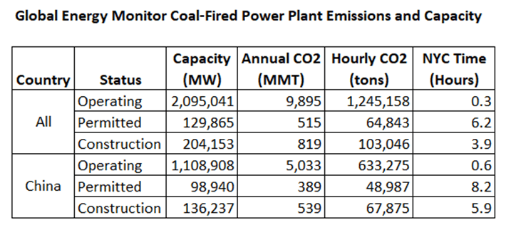 Another characteristic of these politicians is innumeracy. The city fleet has 30,000 vehicles. I calculate that those vehicles are responsible for about 400,000 tons of CO2 emissions per year. Driving down the “city’s carbon footprint” needs to be considered in the context of global emissions. The Global Energy Monitor mission is “to develop and share information in support of the worldwide movement for clean energy”. As part of their mission, they have prepared a spreadsheet with data on all coal-fired power plants in the world. Table 1 is based on that data. It lists capacity and projected annual CO2 emissions for three categories of power plants: operating, permitted but not yet under construction, and under construction. Every hour the operating coal-fired power plants emit 1,245,158 tons of CO2. That means that the CO2 reductions due converting the New York City owned fleet of vehicles will be subsumed by coal fired emissions elsewhere on the globe in 0.3 hours or 19 minutes. This law will not have any discernable effect on global warming.